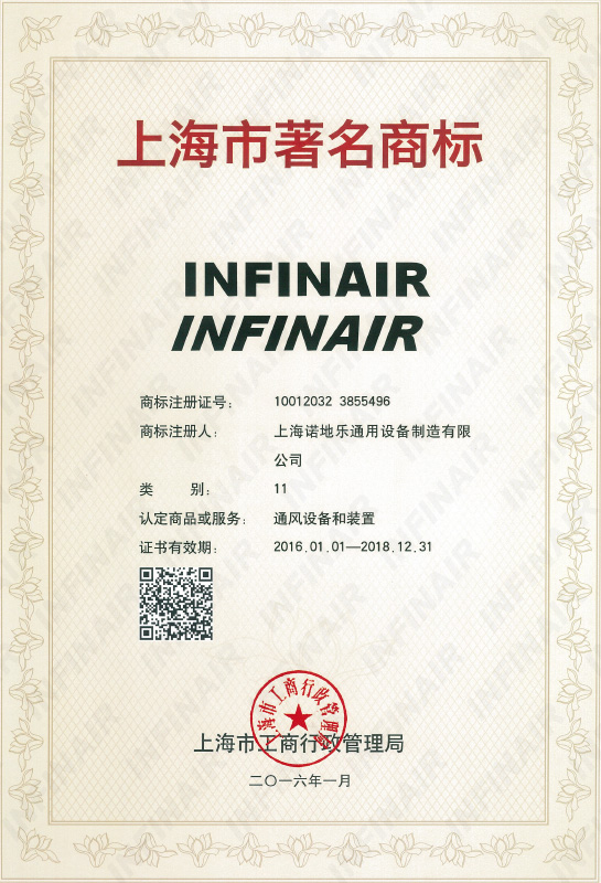 -- “INFINAIR”商標榮獲“上海市著名商標”稱號;
